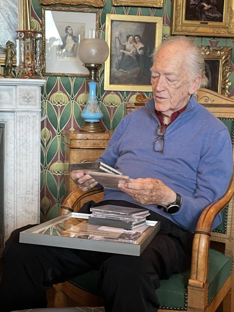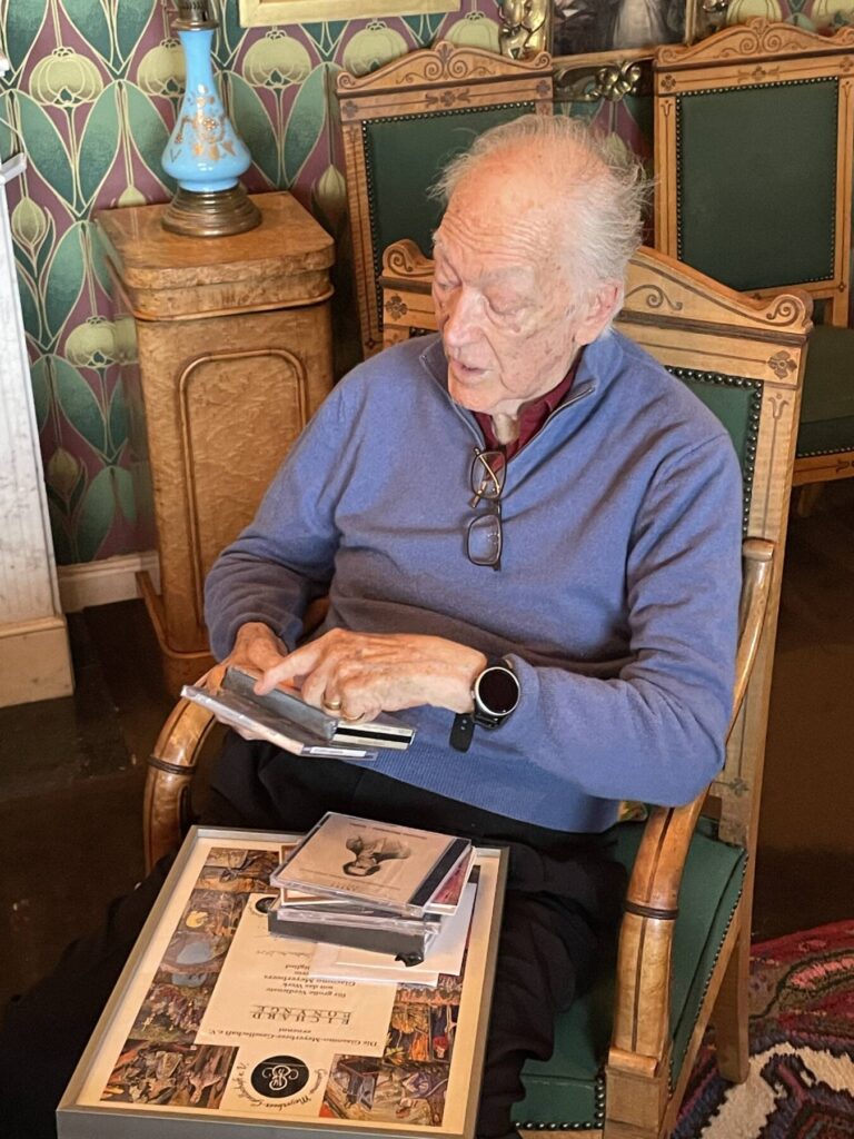 Wie ungeduldig er das Päckchen mit Andrea Chudaks Meyerbeer-Aufnahmen der Lieder, sakralen Werke und der frühen Meyerbeer-Oper ‚Jephthas Gelübde‘ öffnet! Wie neugierig er die Erläuterungen zu Bernd Kliches Szenen aus Meyerbeer-Opern auf dem Rahmen der Urkunde verfolgt! Wie aufmerksam er Alexander Hügis Fotodokumentation, die dieser eigens für diesen Besuch erstellt hat, durchblättert!