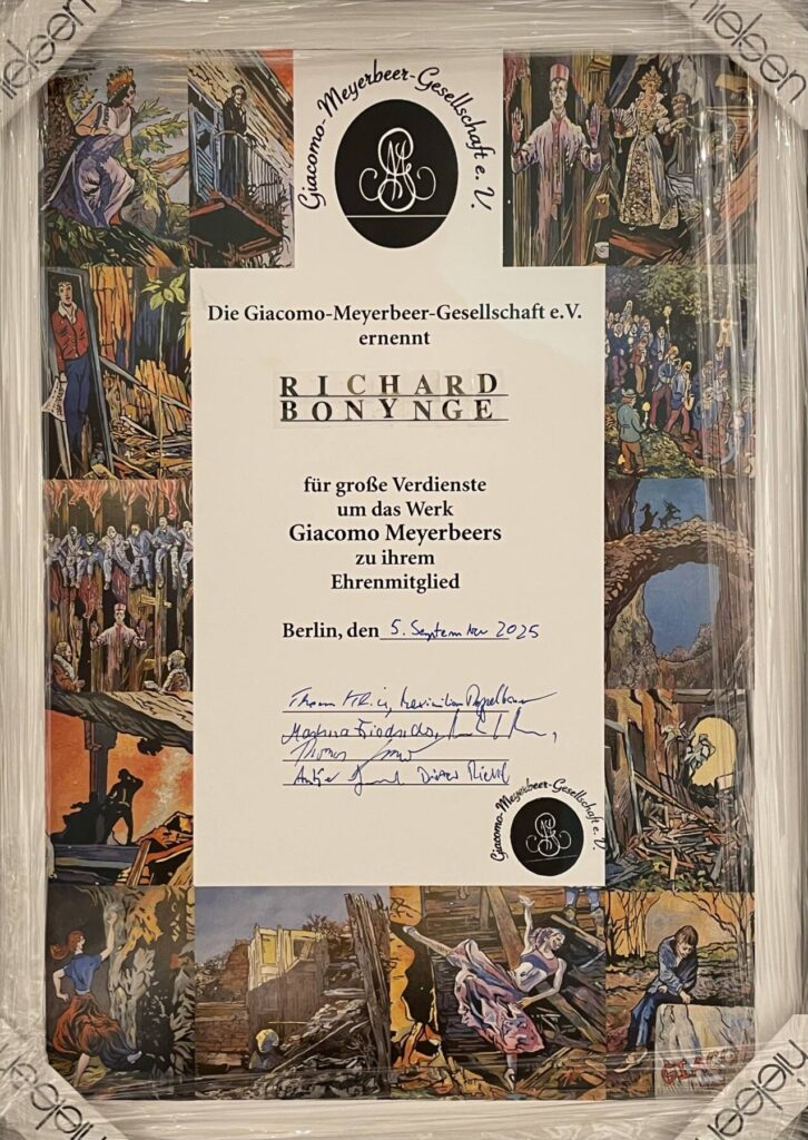 Wir sind froh und stolz, denn Richard Bonynge hat unseren Antrag auf Annahme einer Ehrenmitgliedschaft angenommen. Mr. Bonynge hat in seinem langen Leben zahllose Ehrungen erhalten. Die Giacomo-Meyerbeer-Gesellschaft ist die erste Komponisten-Gesellschaft, die ihm die Ehrenmitgliedschaft verleihen durfte.